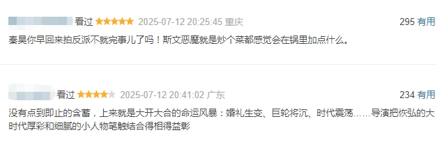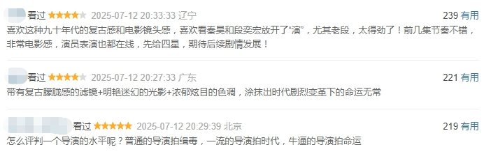 有网友打出了五星好评,表示喜欢这种复古质感与电影镜头感,盛赞导演“把恢弘的大时代厚彩与细腻的小人物笔触结合得相得益彰”。